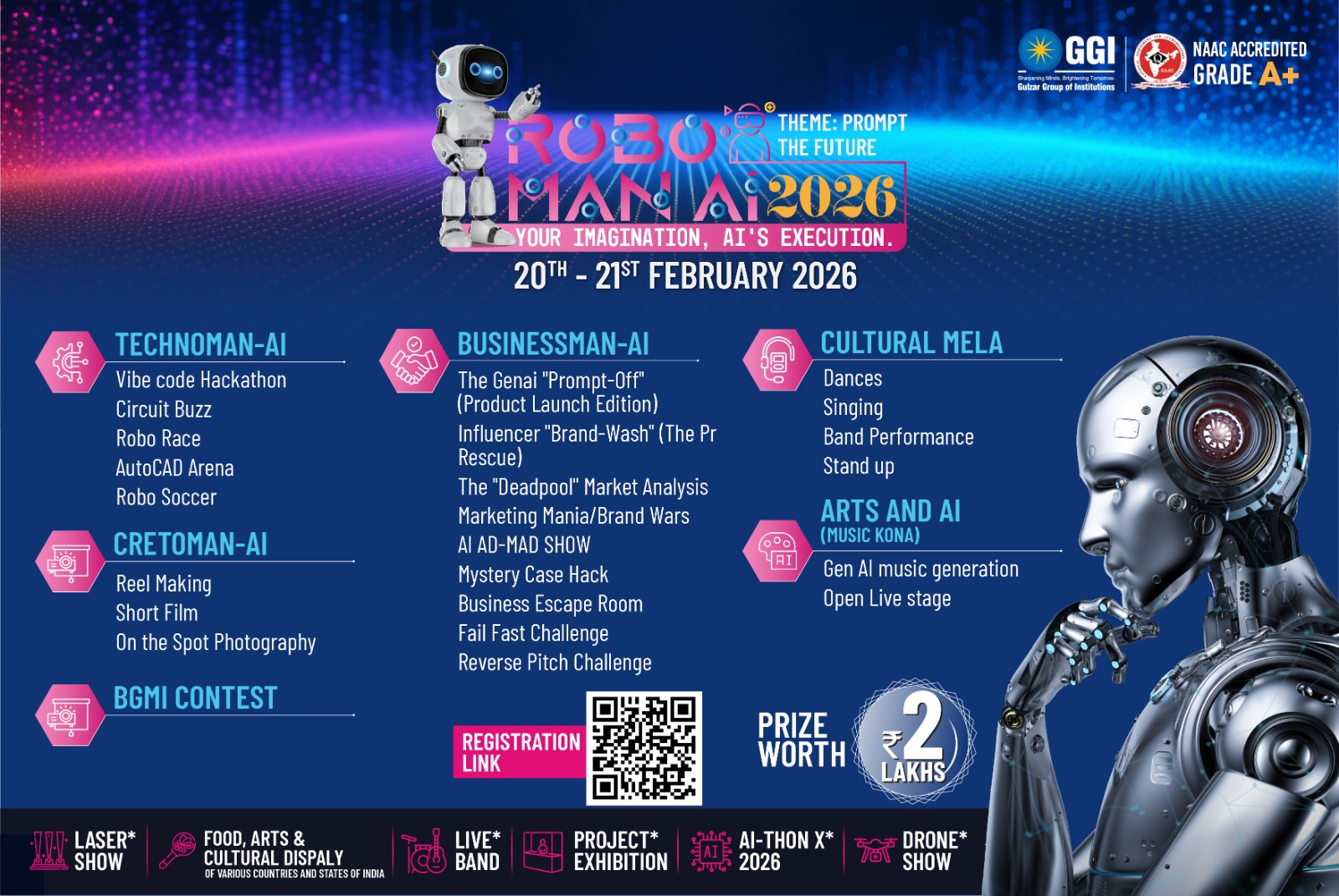 Roboman AI 2026 is a grand, multi-dimensional techno-cultural fest designed to ignite innovation, celebrate creativity, and deliver an unforgettable festival experience. More than just a technology event, it is a vibrant platform where ideas, talent, and future-ready thinking come together under one dynamic roof.