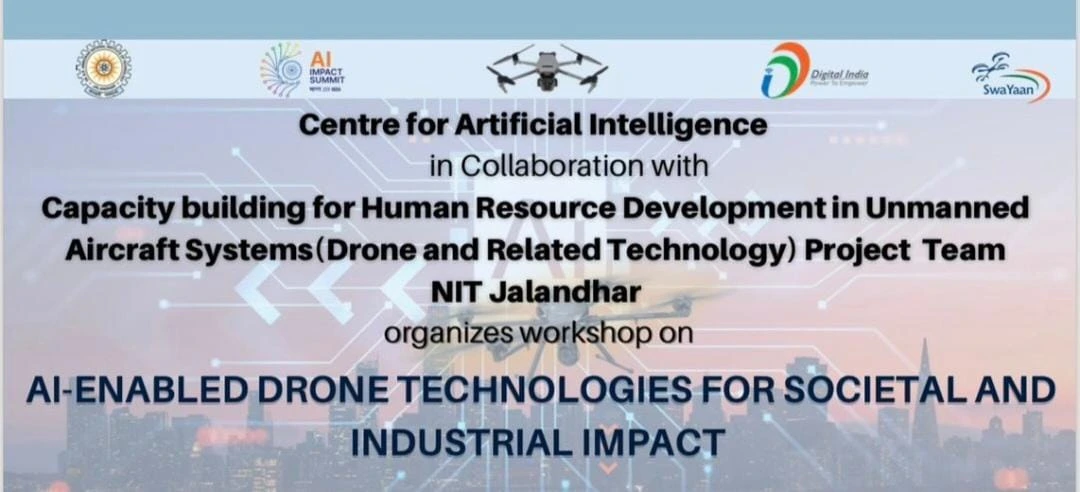 This workshop is organized by the centre for artificial intelligence in collaboration with the Human Resource development in Unmanned Aircraft Systems ( Drone and related Technology) Project Team at NIT , Jalandhar, has been a pivotal platform for this journey to all the participants. It focused on integrating AI with drones to create intelligent , scalable solutions aligning with the India-AI Mission 2026 and the SwaYaan project to strengthen India’s UAS Ecosystem and build a global drone hub.